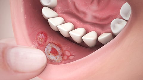Painful sores inside the mouth, on the tongue, soft palate, or inside the cheeks.