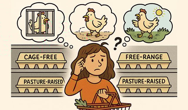Even "cage-free" or "free-range" labels can be misleading. Cage-free hens are usually kept in large pens, but space is still limited—sometimes just 12x12 inches per bird. Free-range hens may get a bit more room inside barns and may or may not have access to the outdoors.