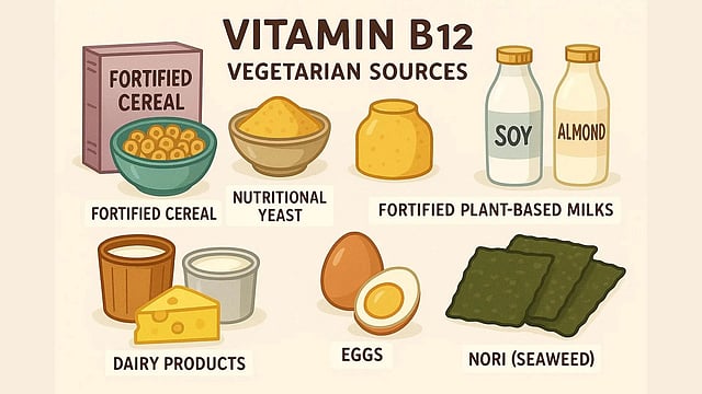 In vegetarian diets, vitamin b12 rich foods consist of dairy products (milk, cheese, yogurt), fortified foods like cereals and plant-based milks, nutritional yeast, and eggs. But strict vegetarian or vegan ones, dietary sources are limited. Fortified foods (fortified cereals, nutritional yeast) may supply some amount, they can also add Plant-Based Milks: Soy, almond with added Vit B12 but many vegetarians remain at risk of inadequate B12 intake.
