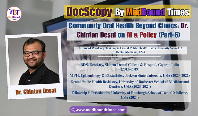 In the part 6 of this interview series at MedBound Times, conducted by Himani Negi and Dr. Akriti Mishra, Dr. Chintan Desai outlines how community oral health initiatives progress from on-ground needs to well-structured outreach programs guided by data, ethical oversight, policy processes, and the expanding role of artificial intelligence.