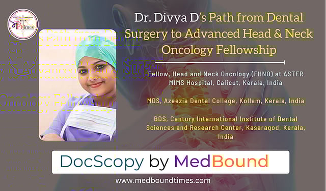 In this edition of DocScopy, Dr. Theresa Lily Thomas interviews Dr. Divya D, an oral and maxillofacial surgeon. Dr. Divya completed her BDS from Century International Institute of Dental Sciences and Research Center, Kasaragod, Kerala, India, and went on to specialize in Oral and Maxillo-Facial Surgery (MDS) from Azeezia Dental College, Kollam, Kerala. Later, she worked as a surgical intern in head and neck oncosurgery in multiple private hospitals under Karkinos healthcare in Kochi.