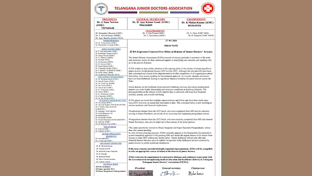 JUDA cautioned that if the issue remains unresolved despite repeated appeals, the association would be compelled to take an appropriate course of action in the interest of junior doctors. At the same time, it reiterated its commitment to constructive dialogue and cooperation with the government to strengthen medical education and healthcare delivery in Telangana.