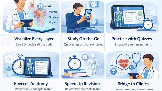 Modern anatomy apps offer interactive 3D visualization, self-paced learning, and clinical integration, making complex structures easier to understand and remember. For today’s medical students, these tools are not just optional, they are becoming essential companions alongside conventional learning methods.