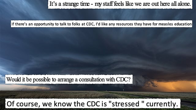 “CDC hasn’t reached out to us locally,” Katherine Wells, the public health director in Lubbock, Texas, wrote in a Feb. 5 email exchange with a colleague two weeks after children with measles were hospitalized in Lubbock. “My staff feels like we are out here all alone,” she added.