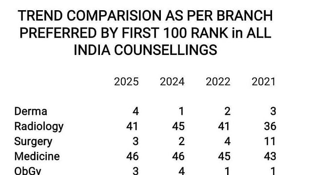 A broader analysis of the first 1000 allotted candidates shows the same pattern. According to data shared on Reddit (r/indianmedschool), MD General Medicine was chosen by 400 candidates, making it the most popular specialty. MD Radio-Diagnosis followed with 289 takers, firmly securing its place as the second most preferred branch. Dermatology had 74 takers, while core surgical branches such as MS General Surgery (61) and MS Orthopaedics (15) saw significantly lower interest. The total number of candidates in the dataset was 1000.