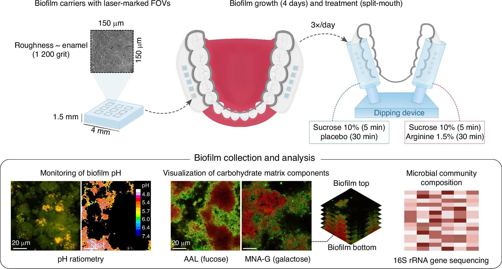 The study included 12 participants who were provided with specialized splints to collect dental biofilms from both sides of the jaw. The participants were asked to dip the specially designed splints into sugar solution for 5 minutes, then dip one side of the splint into distilled water (as placebo) and other side of the splint into arginine for 30 minutes. This procedure was repeated three times a day with arginine applied to the same side.