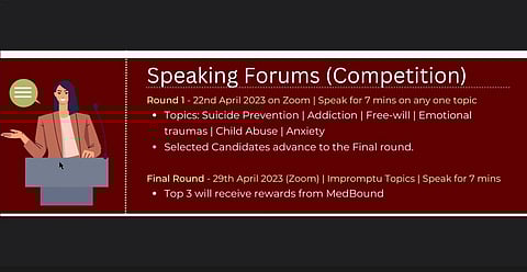 Subha Maheswari, Program coordinator at MedBound, hosted the event and started with an introduction to the event. Dr. Darshit Patel summarised the schedule for the psych forum events and also briefly explained the rules for the final round of the speaking competition. The panelists for the competition included Dr. Munmun Rai, Teaching Assistant at MedBound, Dr. Areez Khoja, and Dr. Gurmeet Kaur.